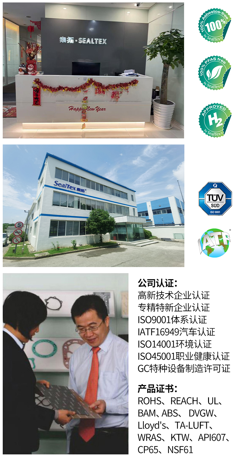SealTex索拓密封可提供各種膨體四氟及改性四氟密封墊、壓縮纖維橡膠密封墊、軟木橡膠密封墊、石墨金屬?gòu)?fù)合增強(qiáng)墊片、植物纖維耐油紙墊、耐高溫云母復(fù)合密封墊、金屬涂覆密封墊RCM等。常見材料型號(hào)ST-2067、ST-4376、ST-2058、ST-3150、ST-9926、ST-3263等廣泛應(yīng)用于汽車、暖通空調(diào)、造船、海工、石油化工、核電、醫(yī)藥食品、新能源等各種工業(yè)領(lǐng)域。并有RoHS、REACH、UL、SVGW、DVGW、TSCA、CP65、ELV、PFAS-free、EN45545-2、FDA、BAM、TA-Luft、API607、ABS、GL、WRAS、NSF61、ACS、KTW、ELL、KTW-BWGL、TZW W270、FIRE-SAFE防火認(rèn)證等證書。可提供API622、ISO15848-1及FDA認(rèn)證的盤根填料;各種盤根及墊片切割工具。提供各種特殊尺寸的輥壓板如2000X2000mm、3000X3000mm、1500X4500m。密封墊厚度從0.15mm起.